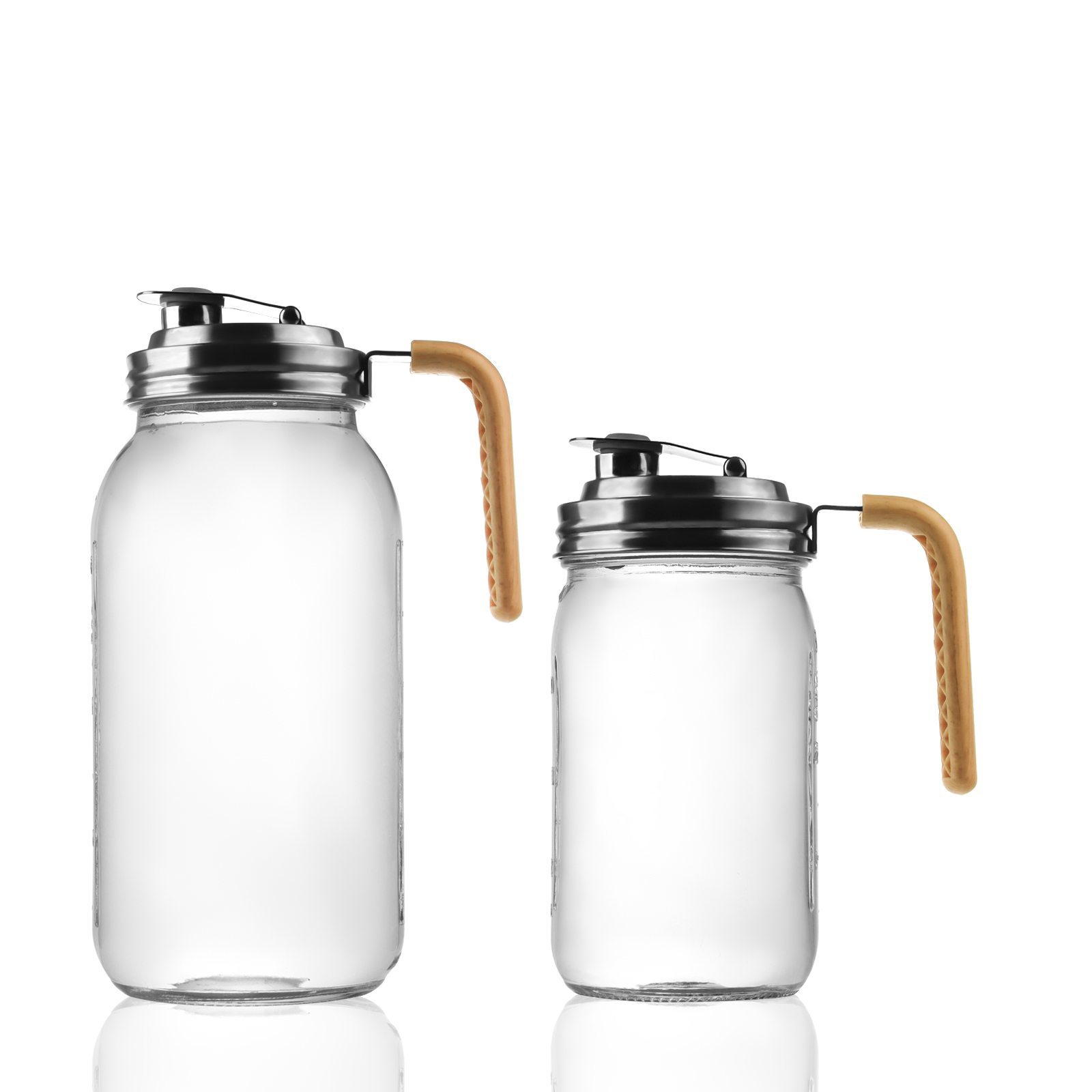 It is a Glass Bottles for Juice Storage converted into a kettle with a handle, with a large capacity, usually used to hold and pour liquids, such as tea, coffee, water, or other beverages. Separate lid and bottle for easy removal and cleaning. The handle design makes the kettle easy to carry and move around, even for outdoor activities or travel. The use of the handle prevents the user from directly touching the body of the glass and prevents the hand from being burned or frozen. The Glass Bottles for Juice Storage has a leak-proof design to avoid leakage when moving or pouring water. Because of its transparent material, it can provide a beautiful visual effect, you can observe the change of tea color when brewing tea or flower fruit tea.