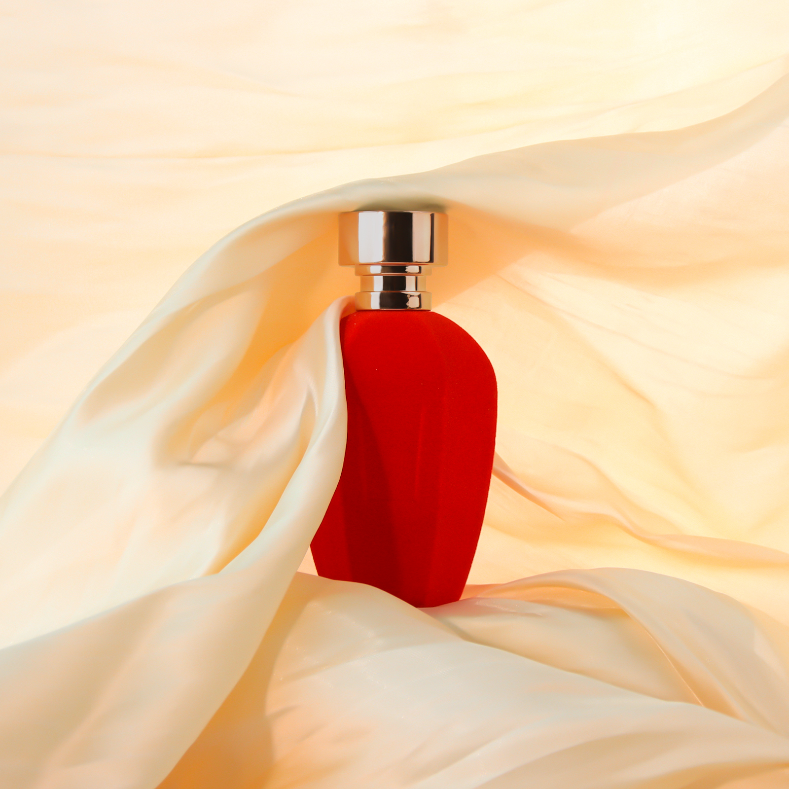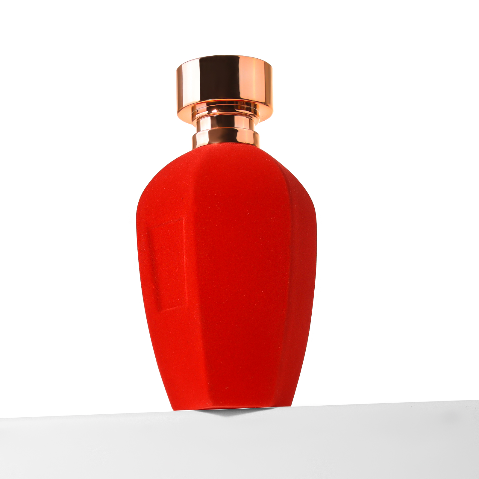 Luxurious red glass perfume bottle with elegant design and airtight, non-reactive glass construction that preserves fragrance quality and enhances aesthetic appeal.