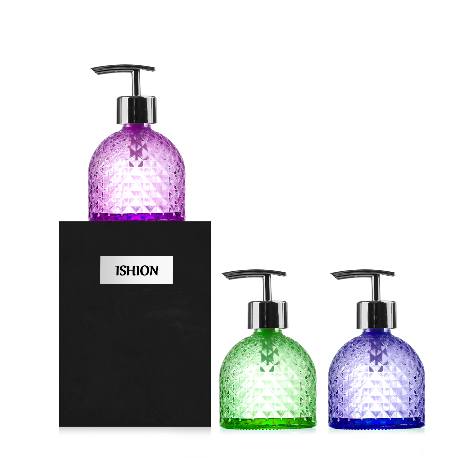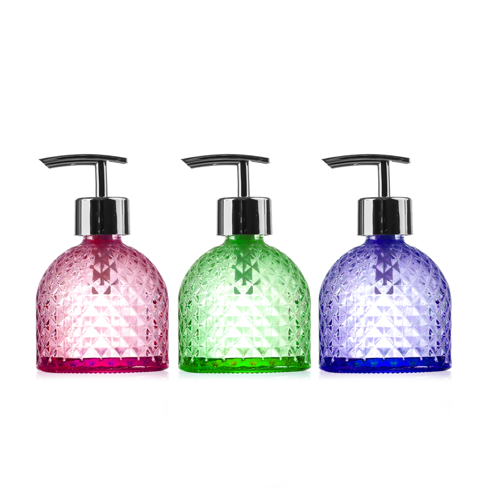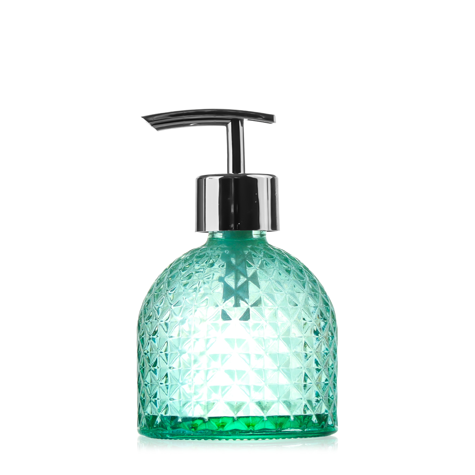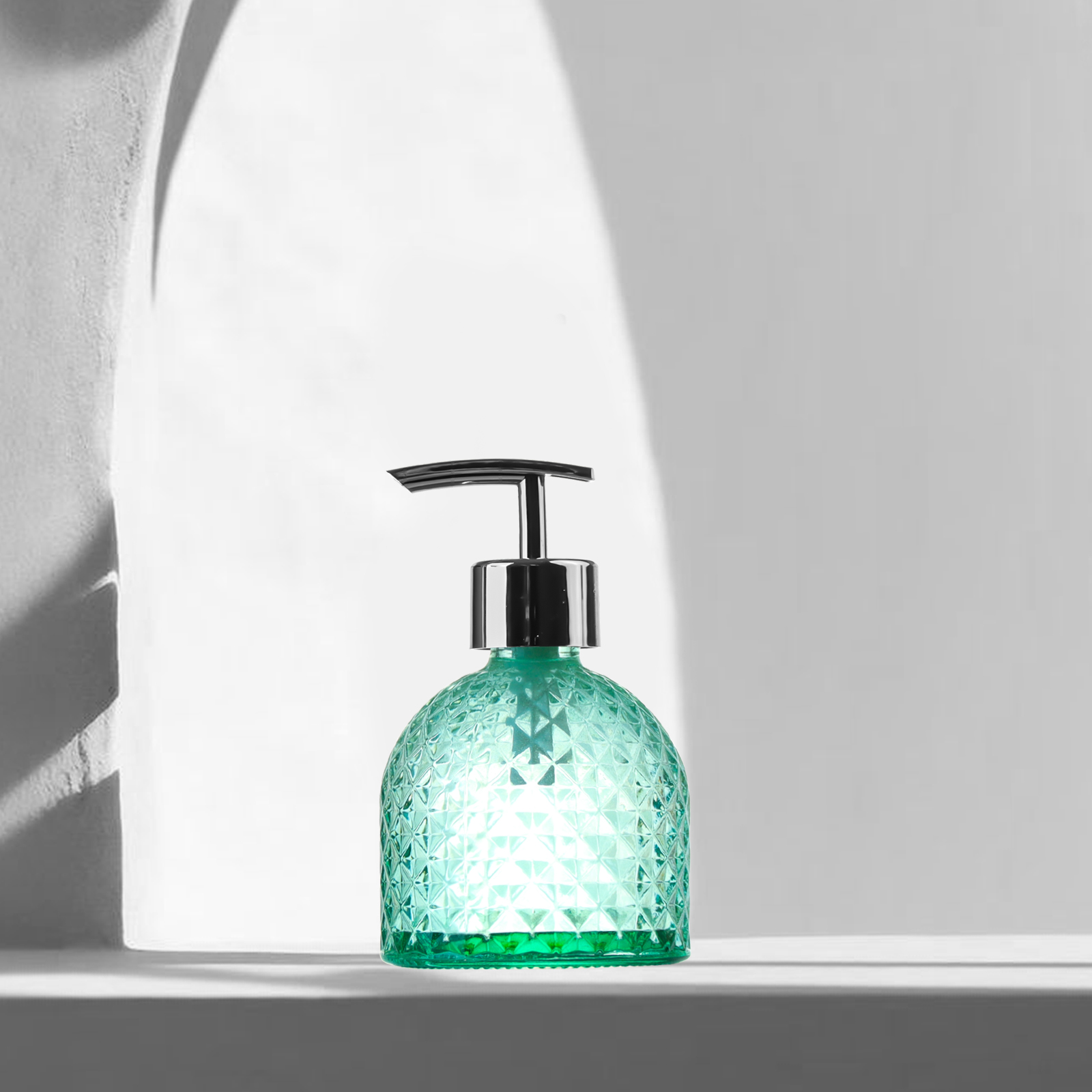 These glass pump bottles boast an exquisite crystal-cut design that adds a luxurious touch to any bathroom or kitchen. Crafted from durable glass, they ensure longevity and resistance to damage. The convenient pump dispensers provide an easy and hygienic way to access soap or lotion, enhancing daily routines with both style and functionality. Available in vibrant colors, they are a perfect blend of aesthetics and practicality.