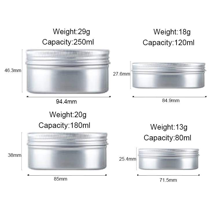 These Aluminum Cosmetic Containers are of premium quality. They feature a sleek and durable design that is perfect for fulfilling a wide variety of storage requirements.Equipped with airtight seals, they can effectively maintain the freshness of the contents inside. Moreover, they come in a diverse range of sizes to meet different needs. They present a sophisticated and professional appearance.These containers are highly suitable for storing cosmetics, food, or travel essentials. Thanks to their lightweight and portable characteristics, they are a versatile option for use both at home and when you are on the move.