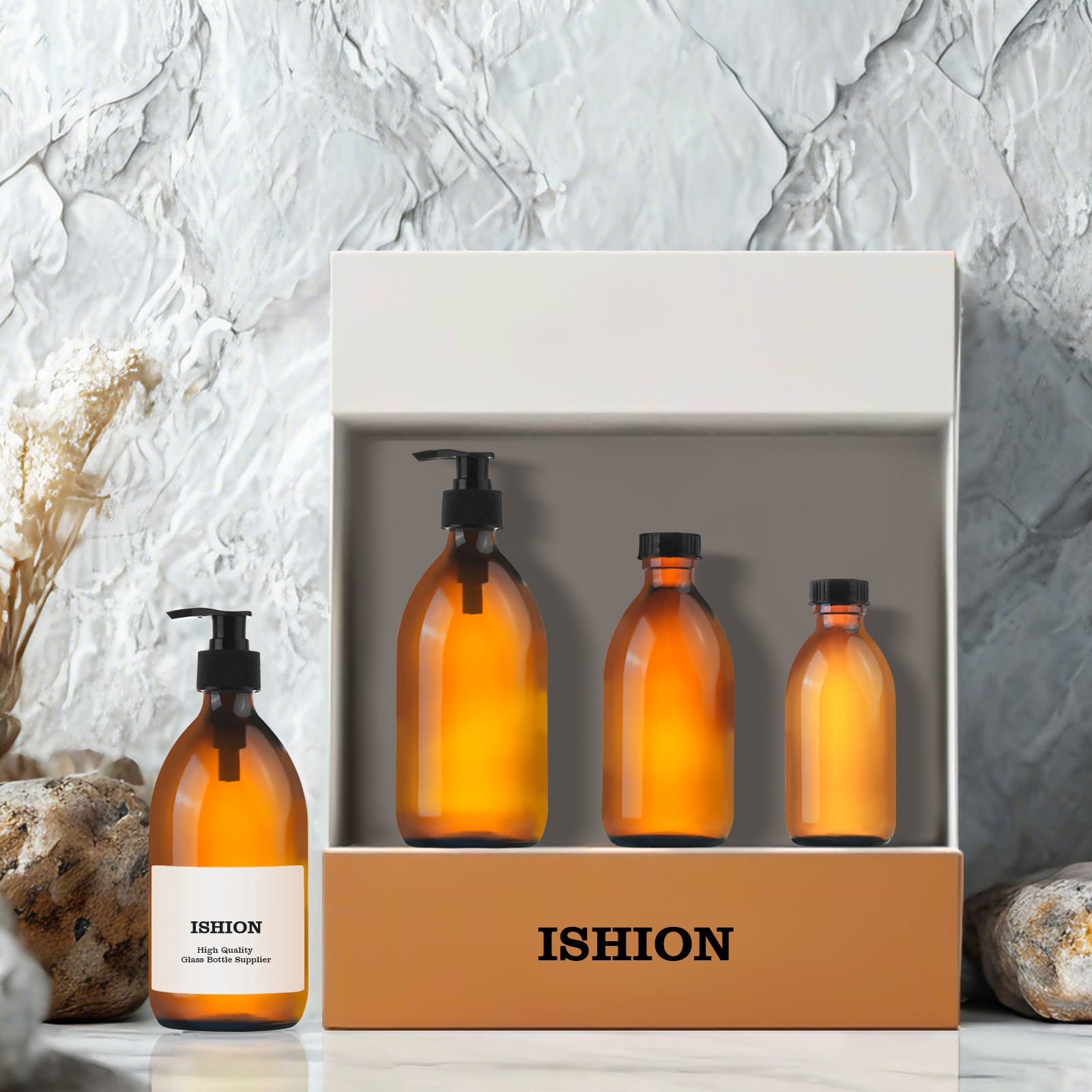 The amber glass bottles exude a sense of sophistication and elegance, making them ideal for high-end cosmetic and personal care products.
