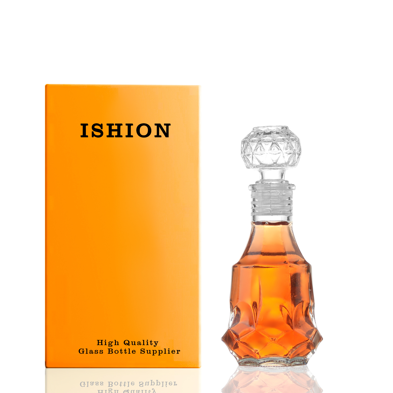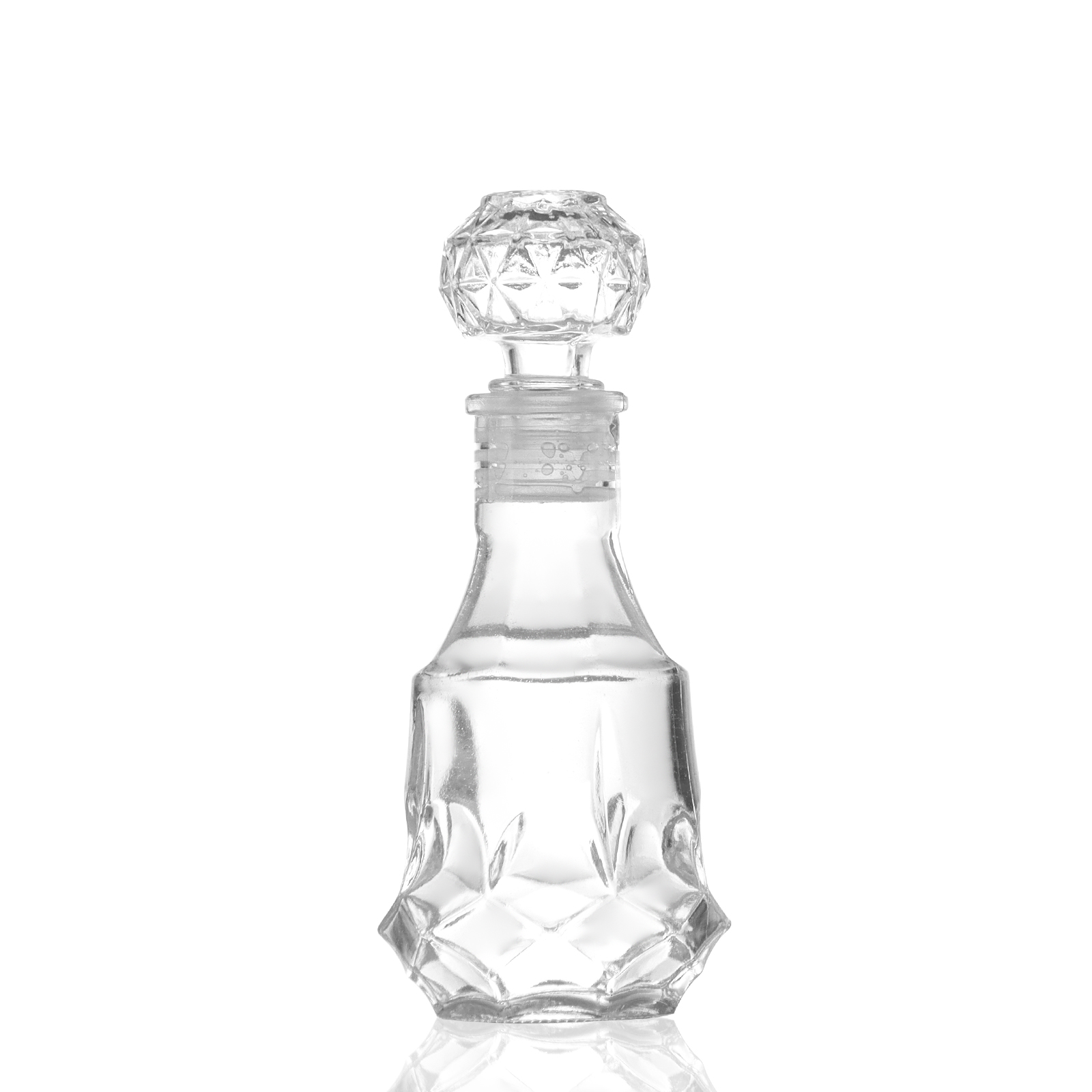 The small glass decanter with stopper has an elegant faceted design, clear glass, nice patterns, ideal for premium spirits.